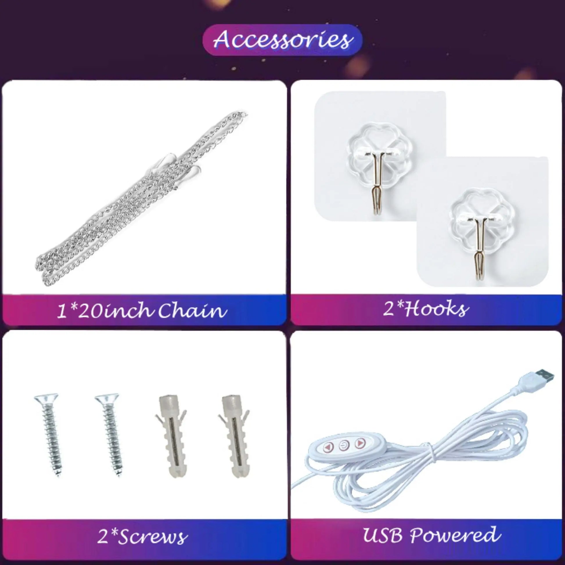 The vibrant LED lights and sleek acrylic design make it for creating a festive atmosphere at parties or as a stylish decoration Package List: 1 x Acrylic Led Led Art Light 1 x 118 inches Wire with USB Interface 1 x Chain 2 x Sticky Hooks 2 x Screws How to Use: 1. Gently unpack your neon sign and remove the protective film before use. 2. We provide 2 sticky hooks, 1 chain, 2 screws, you could be hung on the ceiling, can also be fixed to the wall. 3. Plug the USB cable to a USB port, adaptor or mobile power charger. 4. Turn on the led home signs switch, you can enjoy the shine of LED neon sign now! for your home.